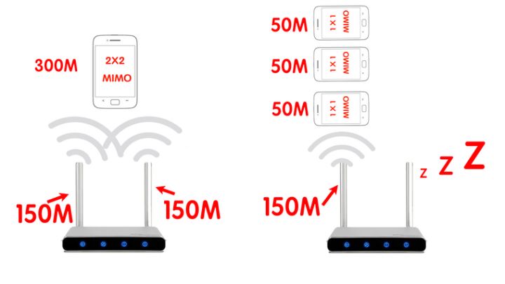 也就是說如果你的路由器是2根天線的,就算你連接了10部1根天線的手機(jī),也同樣只能用到路由器的一根天線。